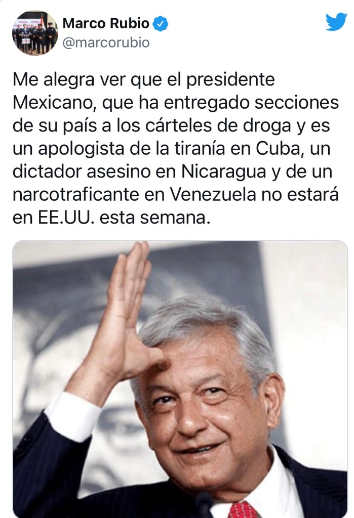 «Me alegra ver que el presidente mexicano, que ha entregado secciones de su país a los cárteles de droga y es un apologista de la tiranía en Cuba, un dictador asesino en Nicaragua y de un narcotraficante en Venezuela no estará en EE.UU. esta semana», escribió en un mensaje en Twitter.