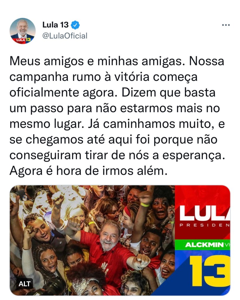 Lula, del Partido de los Trabajadores (PT), comenzó su campaña con la publicación de mensajes en sus redes sociales. «Mis amigos y mis amigas. Nuestra campaña rumbo a la victoria comienza oficialmente ahora. Dicen que basta un paso para no estar más en el mismo lugar. Hemos recorrido un largo camino, y si hemos llegado hasta aquí es porque no han podido quitarnos la esperanza. Ahora es el momento de ir más allá», escribió en su cuenta en Twitter.