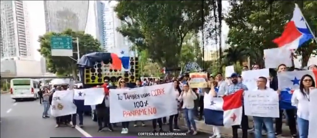 En la ciudad panameña de Santiago, los trabajadores y proveedores de la empresa Minera Panamá realizan una marcha pacífica en rechazo al cierre de la mina.