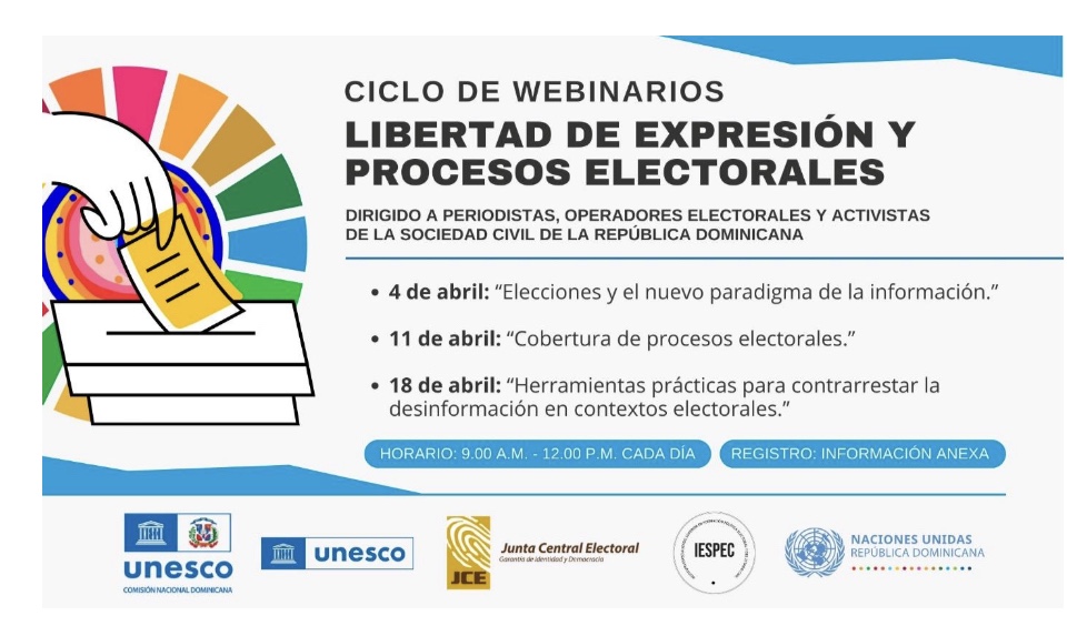 Santo Domingo, RD. – La Junta Central Electoral (JCE), a través del Instituto Especializado Superior en Formación Política Electoral y del Estado Civil (IESPEC), y en conjunto con la Organización de las Naciones Unidas en la República Dominicana y la Comisión Nacional Dominicana para la UNESCO, anunciaron la realización de un ciclo de webinarios sobre “Libertad de expresión y procesos electorales”.