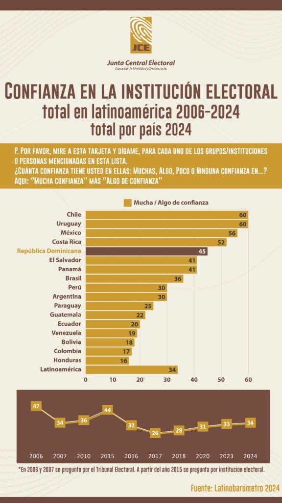 Santo Domingo. – El informe de Latinobarómetro 2006-2024 sitúa a la Junta Central Electoral (JCE) de República Dominicana como la quinta institución electoral de la región en donde hay más confianza y la sexta entre los que piensan que las elecciones son limpias.